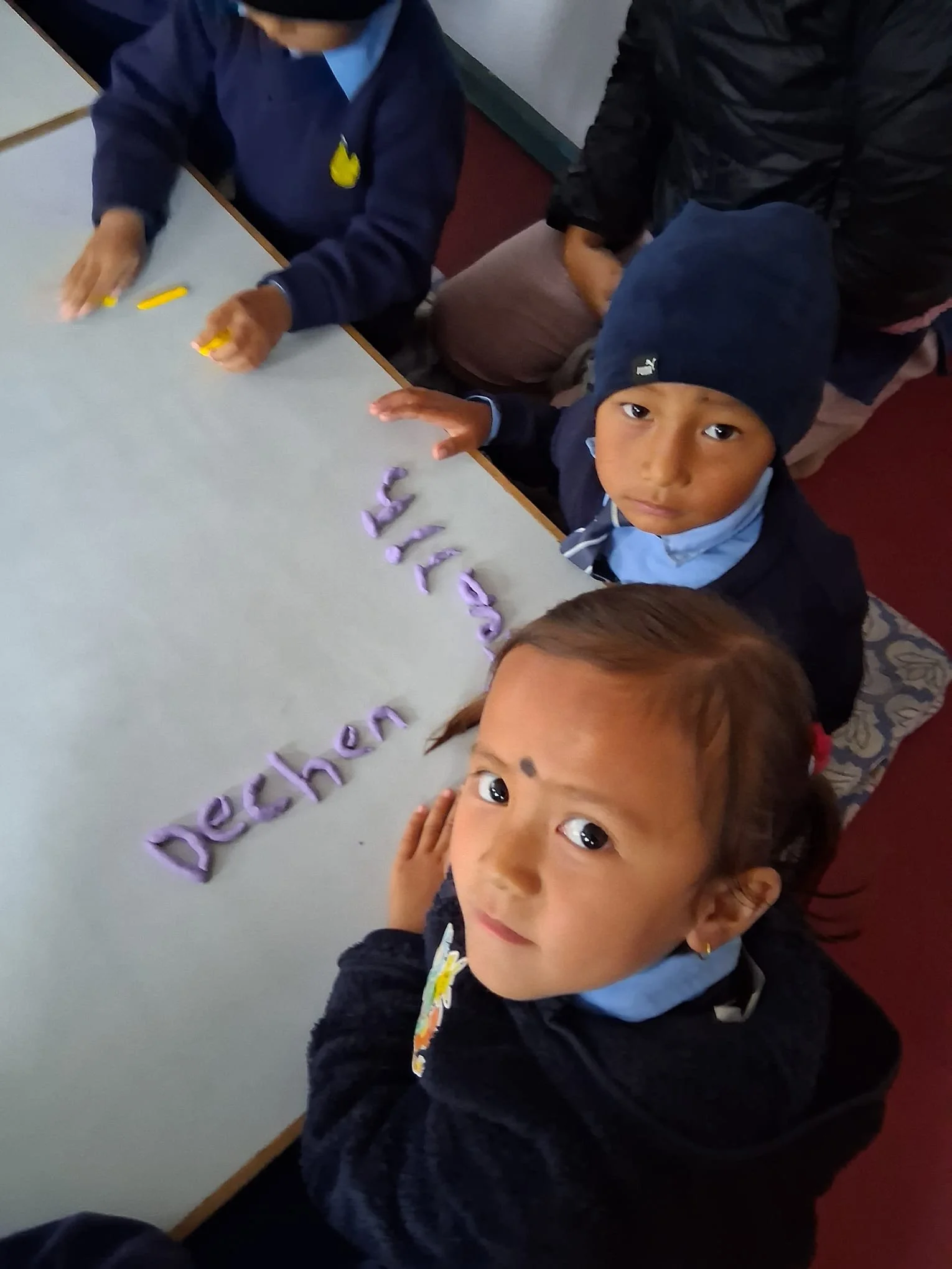Young children at Melamchi Ghyang use play dough to spell their names during a fun lesson led by volunteers.