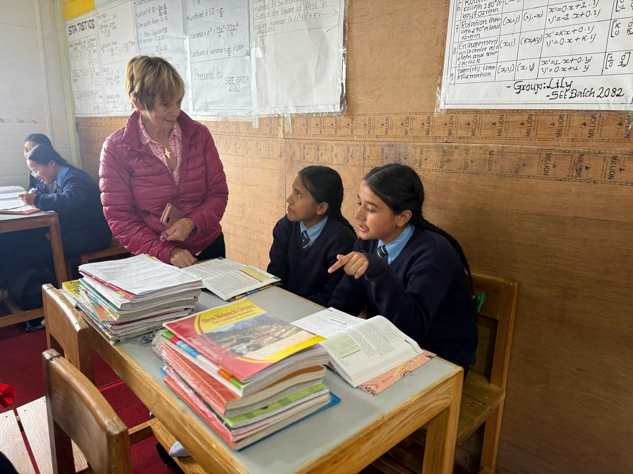 Jinty supports a reading lesson for class 9 children at Melamchi Ghyang during a recent school visit to the school in Helambu region of Nepal.